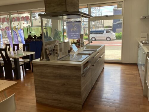 展示してあるタイプはアイランドキッチンで、コミュニケーションが取りやすく、