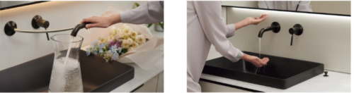 エスクアのウォール水栓はスパウト(吐水口)を引き出して使えるため、花瓶やバケツへの水入れにも使いやすいのです!「センシングシステム」に対応しているため、タッチレスで水の出し止めも可能ですよ🌼