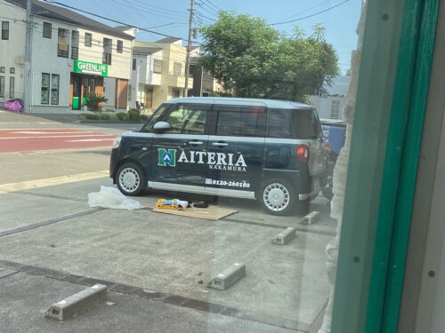 看板屋さんにペタペタアイテリアのマークを貼ってもらいます。