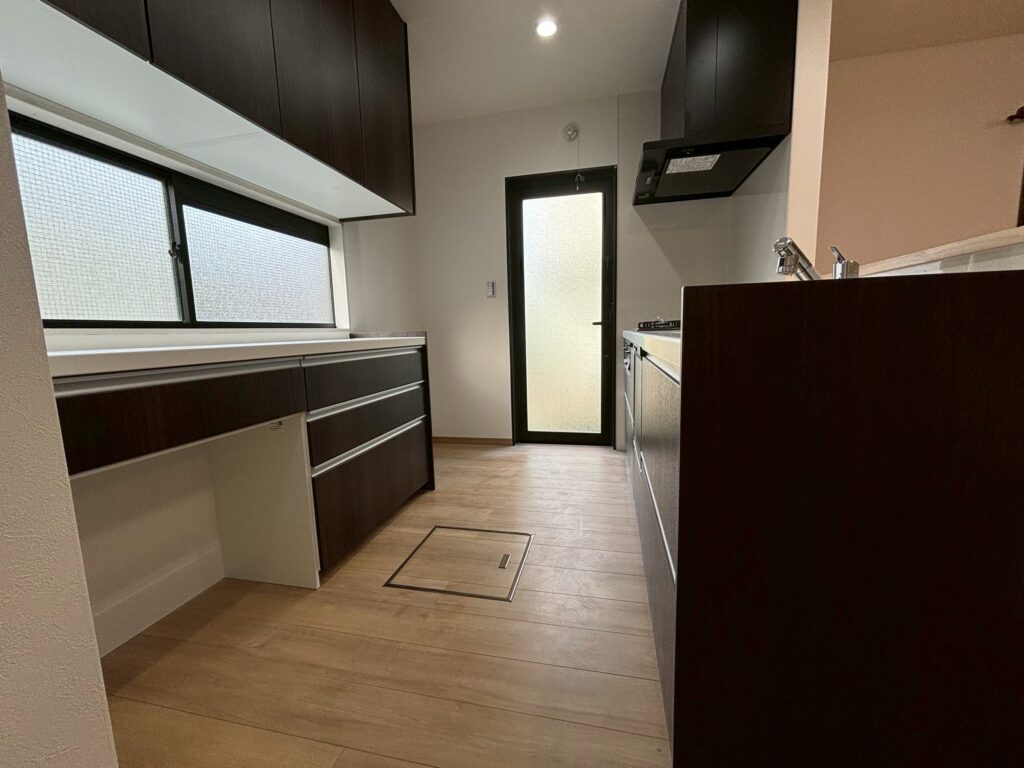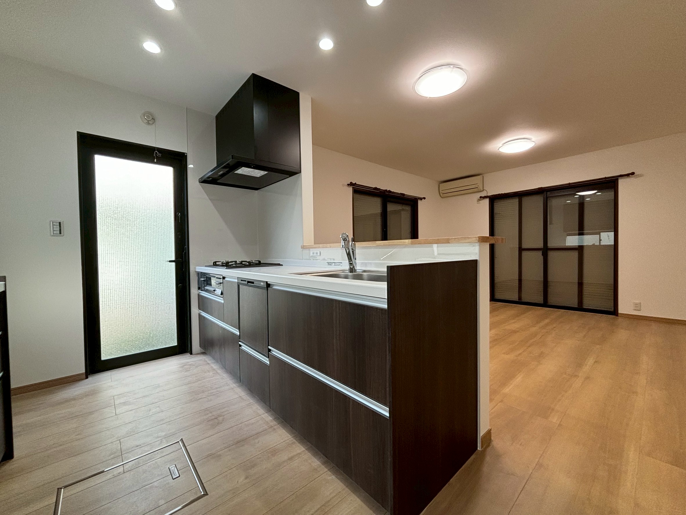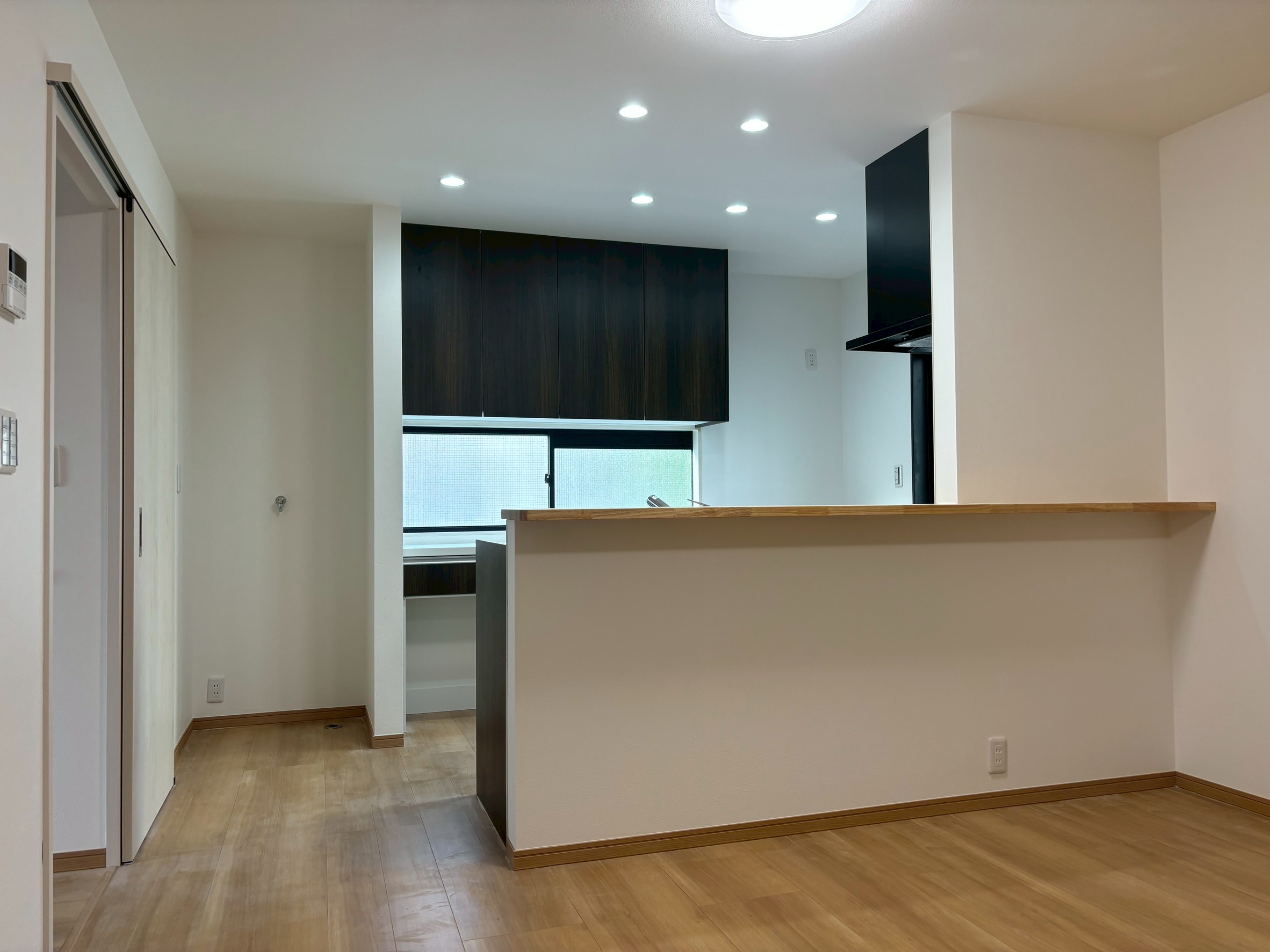 キッチンに立つとリビングに背を向けてしまうことがお悩みでしたが、レイアウト変更をすることで顔を合わせて会話をすることが叶いました。 また、リビングの入り口が2つあったため、一つの引き戸にしたことですっきりと統一感が生まれました。